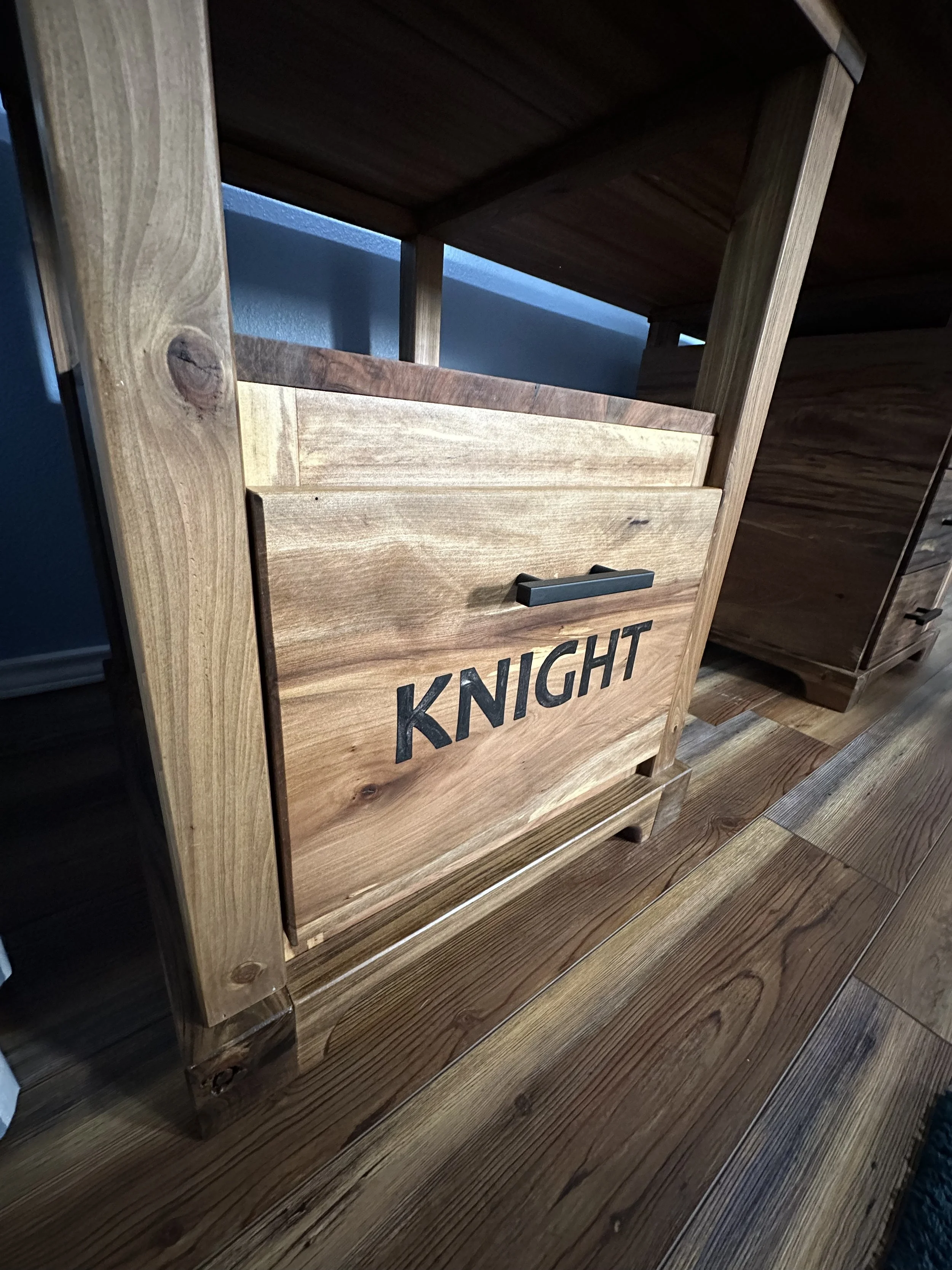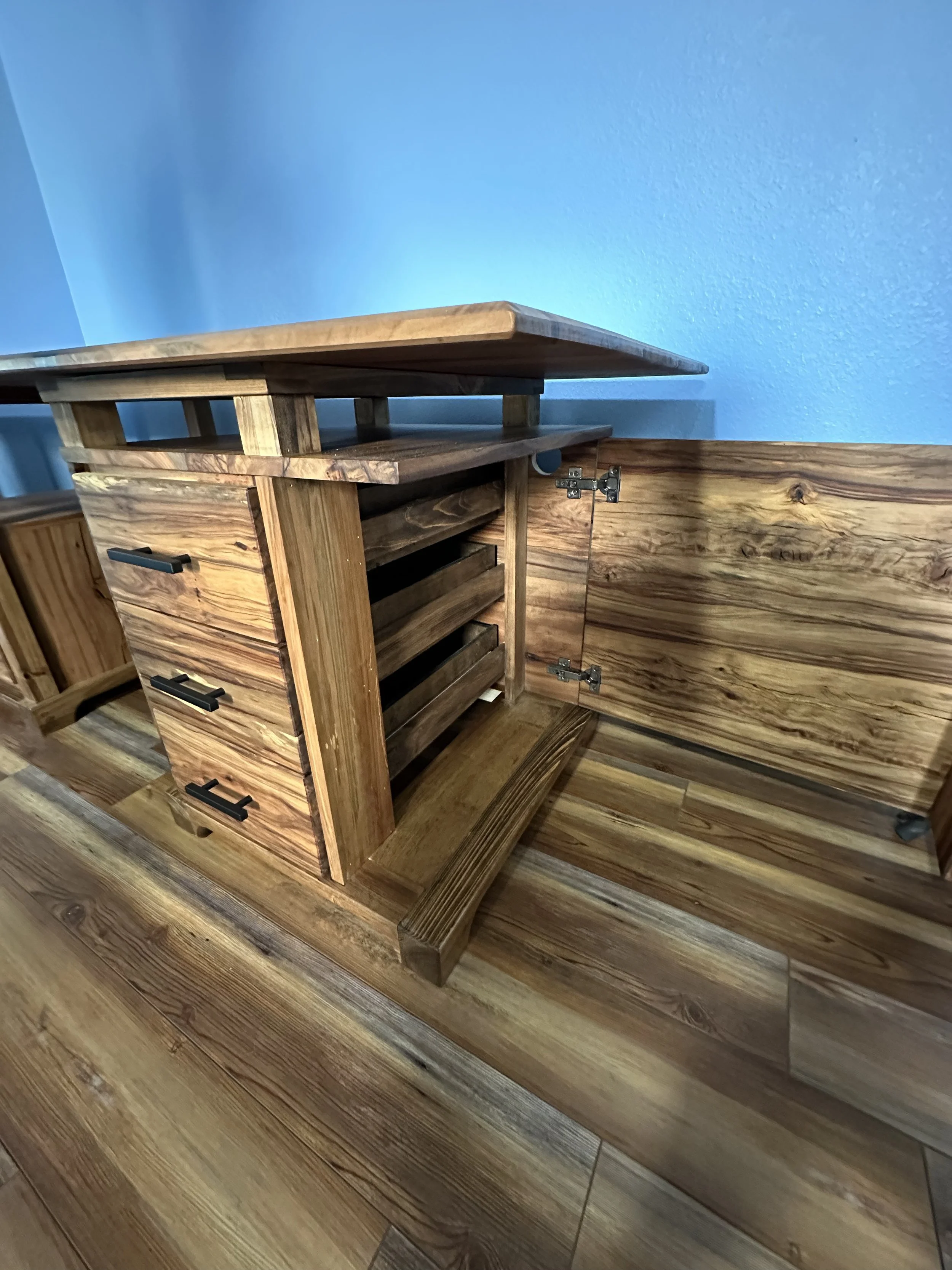 This piece was specially commissioned for my future father-in-law and holds a unique place in my collection. It is the most intricate desk I have created to date, demonstrating my craftsmanship and dedication to detail. I carefully designed the entire piece using Fusion 360, meticulously modeling each individual component with precision. The construction process took approximately three weeks, involving many hours of focused work. To make it truly meaningful, I incorporated personal elements such as a hidden cabinet and the family name elegantly engraved on the front of the larger drawer. Finished with hardwax oil, I look forward to working with this species of wood again, as I thoroughly enjoyed the experience.